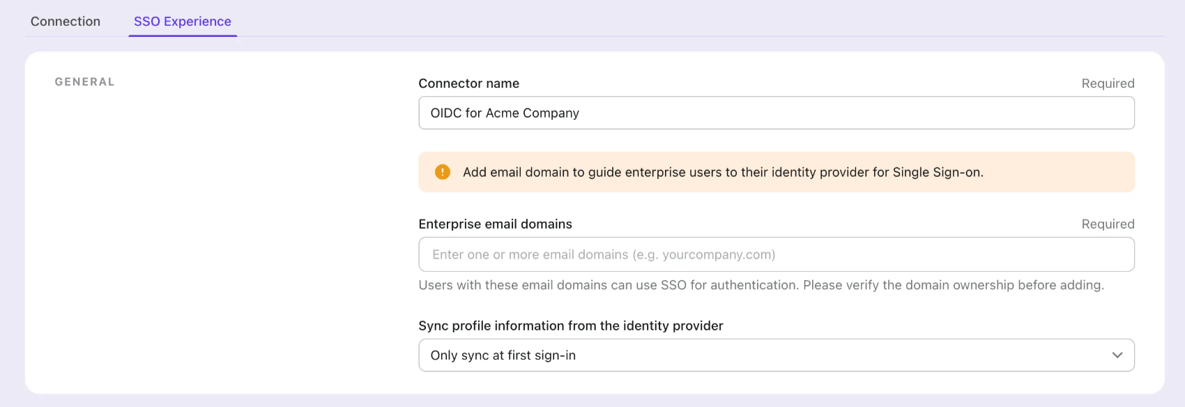 - Customize the SSO experience and enterprise’s email domain in the "Experience" tab. Users sign in with the SSO-enabled email domain will be redirected to SSO authentication.